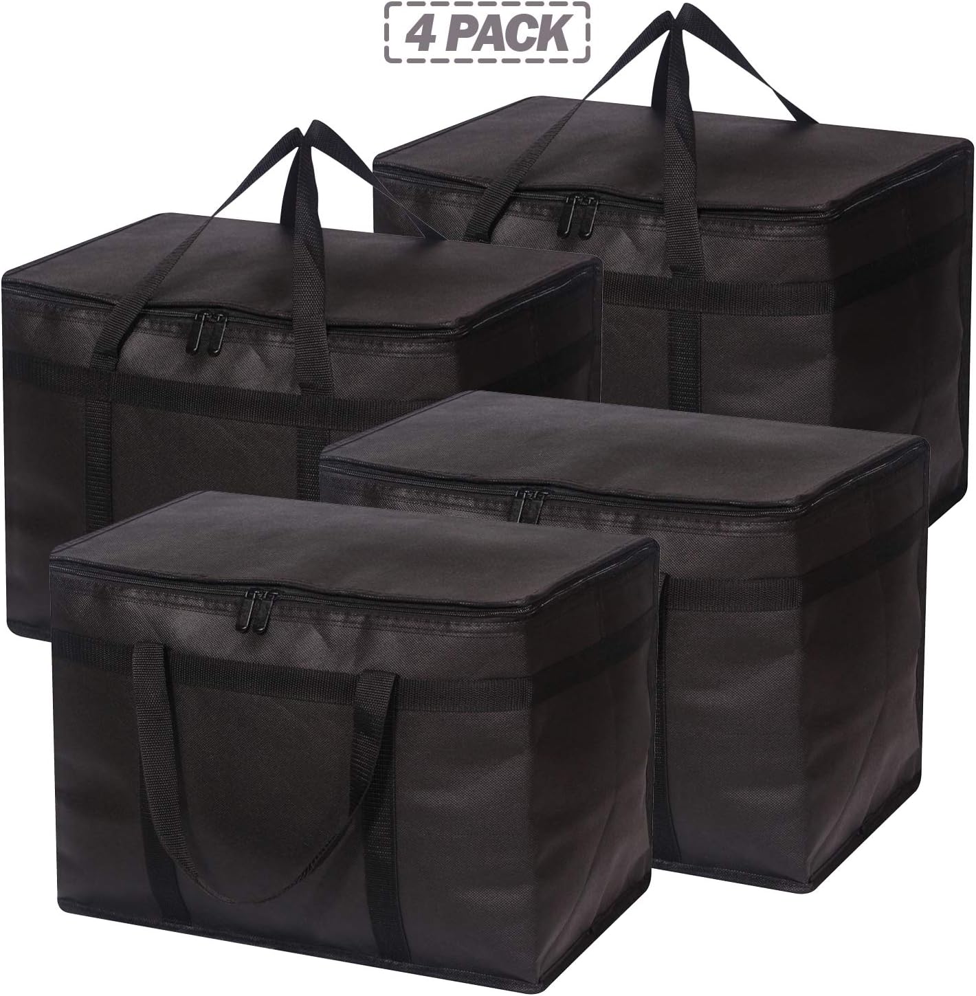 1, Durable and Extra Large Dimensions: 4 Pack. 16.1″ x 13″ x 10.2″ inch. Perfect for large family sized packages, fresh produce, meat, drinks, and more. Strong construction easily supports 30+ lbs. Made from heavy weight non-woven fabric, aluminum covered thermal insulation, and featuring a reinforced dual tab zippered top. dual reinforced handles sewn to bottom of the bag for extra durability & thick removable plastic bottom insert for extra strength to endure the heaviest loads while grocery shopping. 2, CONVENIENT and FORDABLE: The reusable shopping bags are foldable, they are easy to open and close, easy for the grocery packer to fill. The other nice thing about them is that they collapse into a flat shape when not in use making them very easy to store. They are light weigh and portable after folding to carry. Folds flat for easy storage in your kitchen, under the car seat, or in your trunk. Smooth sliding zippered lid keeps items from falling out. Easily wipes clean as needed. 3, KEEPS THINGS COLD:Insulated grocery bags can be used for purchasing cold or frozen food. The best reusable shopping tote is made of cloth zipped up easily. The car/cart bags can be recycled and used for women or men. And you can also use it for a picnic, put all freezer items in the cooler bag. Perfect height for wine bottles. 4, FOOD WARM: The reusable storage bags work great for food delivery for Uber Eats. They are inaulated tote bag kept our food nice and cool. Excellent product for delivering Hot Food! Keeping food cold/frozen during warmer weather.They are also great to use when you travel to family gatherings with pies, pizza or salads. Large food carrying bags. 5, MULTI-PURPOSE: Transport or carry all your hot or cold items! Great for frozen groceries and produce. Makes an ideal food delivery bag. Keep in your trunk for the supermarket, general shopping, farmers markets, picnics, camping, boating, groceries, parties, the beach, tailgating or as a trunk organizer.