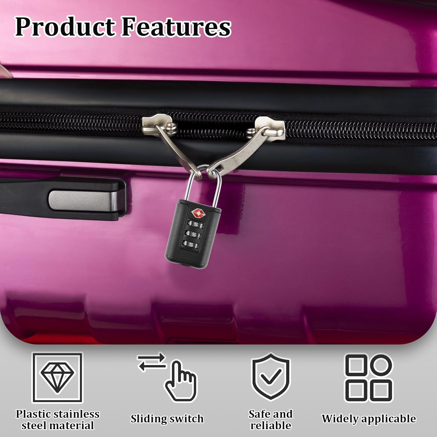 TSA approved lock allows TSA agents to unlock it without damaging your own luggage or non-approved locks. For that luggage without lock, it is safer to add a TSA approved lock that can reduce the risk of stealing and also allows possible inspection by TSA agents easily.This package comes with 3 sets of TSA approved luggage padlock with 3-digit combination lock. The default combination digits is 0-0-0 which can be reset with your own combination by yourself. An instruction sheet is accompanied with each padlock to teach you the steps of changing password.These locks are made of plastic and stainless steel that are well constructed and seem hard to withstand impact. The locks have size of about 1.25×2.5 inches that are moderate and the hooks are suitable to be used on most luggage or zipper bags such as backpacks and travel duffle bags etc. Moreover, the sliding switches of the locks are safe and convenient to use.Although the TSA approved luggage locks are designed for travel use, they may still be used as normal padlocks if required.