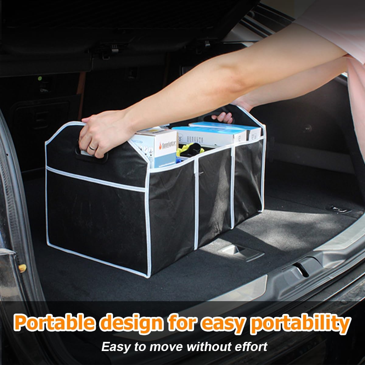 【Large Capacity】: The fully extended dimensions of the automotive trunk organizer is about 21.26”L x 13”W x 9.1”H. There are 3 big compartments, each with plenty of storage space and multiple small pockets on the exterior. And its handle design allows you to pick it up easily. So it brings you a large and more flexible storage space.