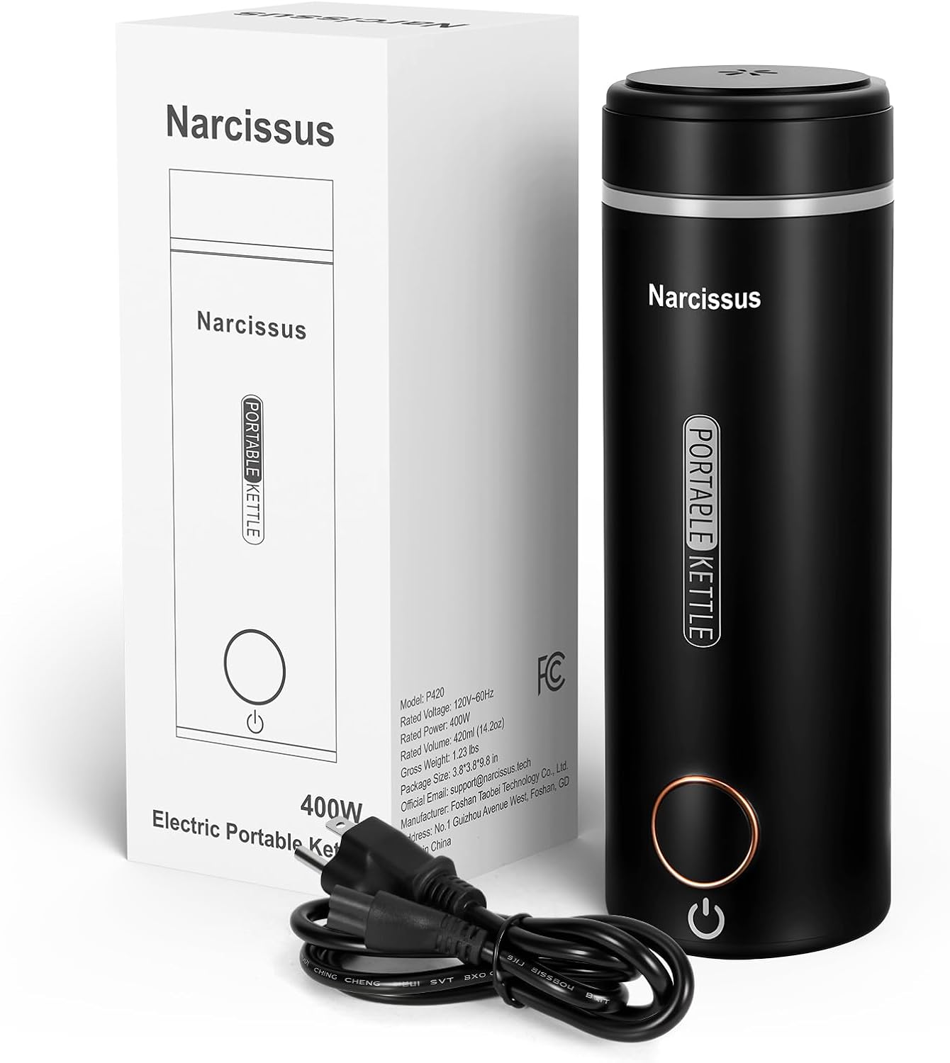 This is a thoughtfully engineered compact appliance that delivers rapid boiling, precise temperature control, and user-friendly safety features. Designed specifically for travelers, students, and solo users, this kettle’s 14.2 oz (420ml) capacity and 400-watt power pack a powerful punch for a small package. Here is a detailed breakdown of its features, usability, and performance.Design and Build QualityThe Narcissus P420 boasts a lightweight, sleek stainless steel interior that ensures water remains free of metallic taste or odors. The exterior is crafted from durable BPA-free plastic, finished in a matte texture for grip and heat resistance. Its compact footprint—roughly 7 inches tall and 4 inches wide—enables easy packing into suitcases, backpacks, or even larger handbags. The detachable 39.3-inch power cord coils neatly for space-efficient storage, with a long length to reach poorly located power outlets common during travel or in cramped hotel rooms.The non-slip rubber feet on the base stabilize the kettle on uneven surfaces, which can be critical when boiling in transit scenarios like buses, trains, or RVs. The lid features a secure locking mechanism with steam vents to safely release pressure while preventing spills. Wide opening ensures easy filling and cleaning.Heating Power and Temperature OptionsEquipped with a robust 400-watt heating element, the P420 rapidly brings its 420ml capacity to temperature in approximately 2 to 3 minutes—significantly faster than microwave heating or most hotel coffee makers.The highlight of this model is the digital one-touch control panel featuring five preset temperature options tailored to different beverages and needs:115°F (45°C): Ideal for warming baby formula or milk without scorching140°F (60°C): Best for delicate herbal teas where lower temperatures preserve subtle flavors175°F (80°C): Perfect for green and white teas that can become bitter if overheated195°F (90°C): Optimal for brewing oolong teas, pour-over coffee, and other aromatic brews212°F (100°C): Full rolling boil suitable for black tea, instant cups, soups, or sterilizing waterWater is heated precisely to the selected temperature, and the device automatically shuts off upon reaching it, preserving energy and preventing accidental overheating. This feature provides a notable upgrade over single-temperature kettles or basic travel mugs with heating functions, ensuring beverage quality and safety.Safety Features and Ease of UseBeyond rapid boiling, the P420 incorporates several safety safeguards. Boil-dry protection prevents the unit from operating without water, avoiding damage and fire risk. The exterior remains cool to the touch during and after operation—a feature that significantly reduces burn risk, especially in confined spaces.The lid locks securely with a button release, allowing steam to vent safely while minimizing accidental openings or spills. The wide opening also simplifies adding water, tea leaves, or instant ingredients directly without spillage. After use, it cools quickly for easy packing without waiting extended periods.Practical Applications and User ExperienceThe kettle’s capacity is perfectly tuned for single or dual servings, making it ideal for business travelers, students, campers, or anyone needing hot water quickly without sacrificing quality. Users report consistently faster boiling times and better temperature control compared to hotel room kettles or microwave heating, resulting in improved flavor extraction for teas and coffees.Cleaning is effortless; the stainless interior resists staining and odors, and rinsing after each use prevents buildup. Descaling with vinegar solution every few weeks keeps the heating element efficient, especially in areas with hard water. The power cord’s length flexibly accommodates awkward outlet locations, and the compact design fits both small countertops and travel bags with ease.Limitations and ConsiderationsWhile travel-friendly, the modest 14.2 oz capacity may require multiple boils if serving multiple people. The kettle does not feature a keep-warm function, so water cools relatively quickly unless insulated post-boil. Voltage compatibility is designed for 120V systems, so international travelers should verify adapter requirements or voltage compatibility before use.Final VerdictThe Narcissus P420 Travel Electric Kettle strikes an excellent balance of portability, performance, and precision temperature control usually reserved for larger, stationary kettles. Its fast boil times, five targeted temperature presets, and robust safety features make it a standout choice for travelers and small-scale users who demand both convenience and culinary quality.For those prioritizing travel-friendly design and control over their hot beverages, this kettle offers an unbeatable combination of rapid heating, safety, and precision in an ultra-compact form.