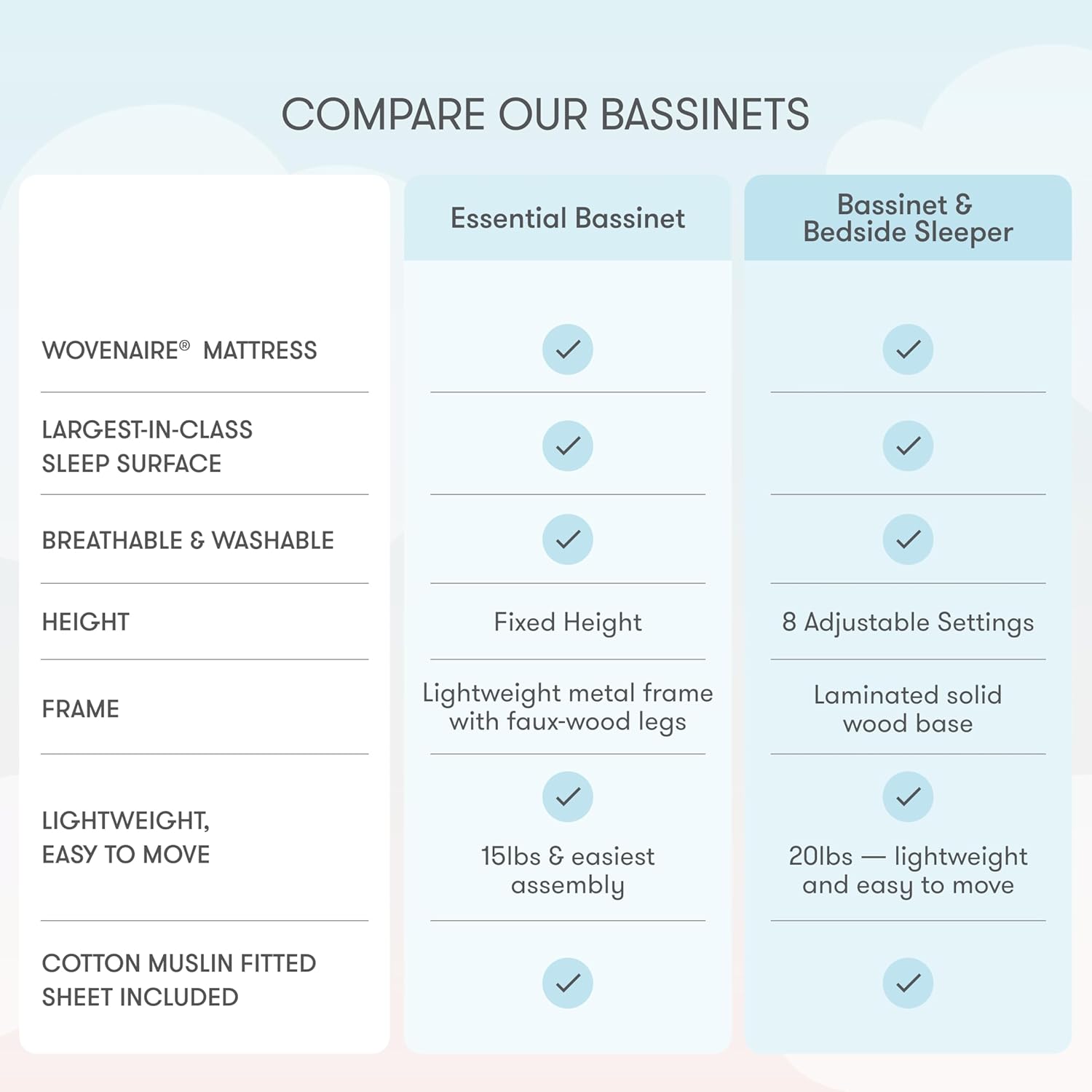 The only standalone bassinet with a Wovenaire breathe-thru mattress for optimal airflow, safety and keeping baby comfortable. The breathable mesh walls of our essential bassinet allow unhindered airflow while providing an unobstructed view of your baby.